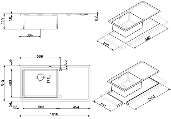 Die SMEG LFT 100S ist eine Einbau Spüle mit Flachrahmen und einer Breite von 100 cm und einem Nischenmaß von 80 cm. Sie verfügt u.a. über eine Ablaufgarnitur, einen Syphon mit Schlauchanschluß und Befestigungsmaterial.