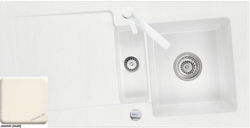 Hinweis: ist auf der oben stehenden Produktabbildung auf der Spüle ein runder Drehknebel zu sehen, handelt es sich um die Version mit Excenter-Betätigung. Eine eventuell abgebildete Armatur gehört nicht zum Lieferumfang.