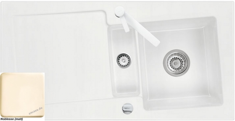 Hinweis: ist auf der oben stehenden Produktabbildung auf der Spüle ein runder Drehknebel zu sehen, handelt es sich um die Version mit Excenter-Betätigung. Eine eventuell abgebildete Armatur gehört nicht zum Lieferumfang.