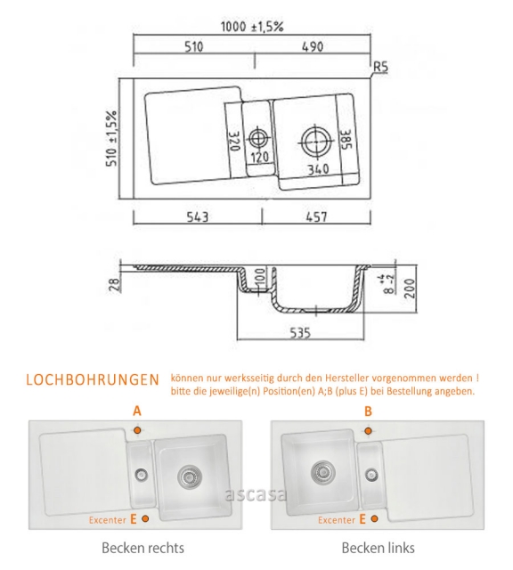 - Diese Spüle verfügt über 2 Möglichkeiten für Lochbohrungen. Diese können nur mit Spezial-Werkzeug des Herstellers vorgenommen werden! Ein Durchbohren vor Ort, auch durch Fachbetriebe, ist nicht möglich!
