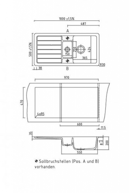 - Der Auslieferungszustand der Spüle ist inklusive vorgestanzter Lochbohrungen (serienmäßige Vorbohrung); die Oberseite der Spüle ist verschlossen und muß vor Ort an den gekennzeichneten Stellen durchstoßen werden. Soll dies werksseitig vom Hersteller vorgenommen werden, wird dafür 13,-- Euro pro Spüle berechnet