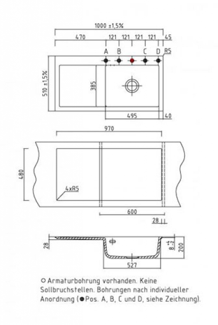 • Der Auslieferungszustand der Spüle beinhaltet eine Lochbohrung für die Armatur. Es sind keine Sollbruchstellen vorhanden; eine oder weitere Durchbohrung(en) kann nur im Werk des Herstellers Systemceram vorgenommen werden. Bitte geben Sie uns dafür exakt die von Ihnen gewünschte Position auf der Spüle an, gern auch anhand einer separaten Email, oder nehmen Sie diesbezüglich mit uns Kontakt auf. Bitte beachten Sie auch, daß Sie durch diese persönliche Positionierung der Lochbohrung einen für Sie individualisierten Artikel bestellen und erwerben, der nur für Sie speziell angefertigt wird. Diese Individualisierung und die damit verbundene nicht gegebene Möglichkeit eines anderweitigen Verkaufes durch uns kann zu einem Nicht-Wirksamwerden des Widerrufrechtes führen, welches individualisierte Produkte ausdrücklich ausnimmt. (Auf eine mit Produktmängeln zusammenhängende Reklamation hat dies selbstverständlich keinen Einfluß). Bitte sprechen Sie uns ggfs. hierauf an.