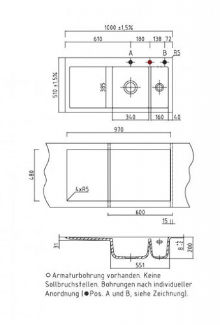 • Der Auslieferungszustand der Spüle beinhaltet eine Lochbohrung für die Armatur. Es sind keine Sollbruchstellen vorhanden; eine oder weitere Durchbohrung(en) kann nur im Werk des Herstellers Systemceram vorgenommen werden. Bitte geben Sie uns dafür exakt die von Ihnen gewünschte Position auf der Spüle an, gern auch anhand einer separaten Email, oder nehmen Sie diesbezüglich mit uns Kontakt auf. Bitte beachten Sie auch, daß Sie durch diese persönliche Positionierung der Lochbohrung einen für Sie individualisierten Artikel bestellen und erwerben, der nur für Sie speziell angefertigt wird. Diese Individualisierung und die damit verbundene nicht gegebene Möglichkeit eines anderweitigen Verkaufes durch uns kann zu einem Nicht-Wirksamwerden des Widerrufrechtes führen, welches individualisierte Produkte ausdrücklich ausnimmt. (Auf eine mit Produktmängeln zusammenhängende Reklamation hat dies selbstverständlich keinen Einfluß). Bitte sprechen Sie uns ggfs. hierauf an.