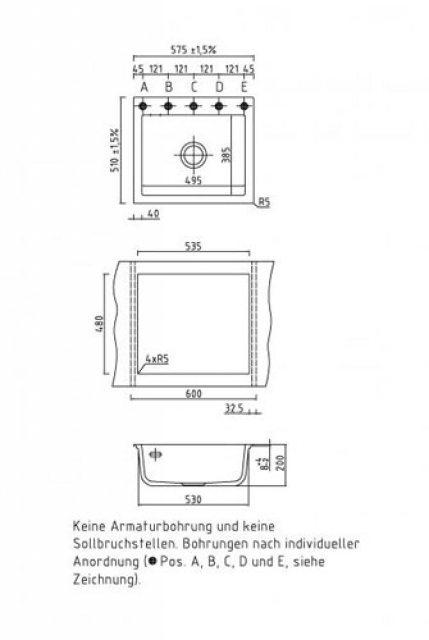• Der Auslieferungszustand der Spüle beinhaltet KEINE Lochbohrung. Es sind keine Sollbruchstellen vorhanden; eine oder weitere Durchbohrung(en) kann nur im Werk des Herstellers Systemceram vorgenommen werden. Bitte geben Sie uns dafür exakt die von Ihnen gewünschte Position auf der Spüle an, gern auch anhand einer separaten Email, oder nehmen Sie diesbezüglich mit uns Kontakt auf. Bitte beachten Sie auch, daß Sie durch diese persönliche Positionierung der Lochbohrung einen für Sie individualisierten Artikel bestellen und erwerben, der nur für Sie speziell angefertigt wird. Diese Individualisierung und die damit verbundene nicht gegebene Möglichkeit eines anderweitigen Verkaufes durch uns kann zu einem Nicht-Wirksamwerden des Widerrufrechtes führen, welches individualisierte Produkte ausdrücklich ausnimmt. (Auf eine mit Produktmängeln zusammenhängende Reklamation hat dies selbstverständlich keinen Einfluß). Bitte sprechen Sie uns ggfs. hierauf an.