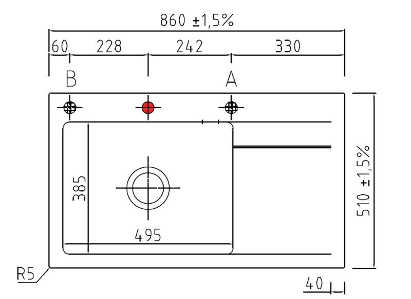 • Option Lochbohrungen: Wenn Sie wünschen, dass aus Sicherheitsgründen die zusätzlichen Lochbohrungen werksseitig vom Hersteller vorgenommen werden sollen, wählen Sie bitte diese Option. Hierfür benötigen wir von Ihnen die Nummern/Positionen des Hahnlochs/der Hahnlöcher, die Systemceram für Sie durchbohren soll. Bei der Spülenversion mit Handbetätigung benötigen Sie 1 Hahnlochbohrung (bereits werkseitig vorhanden) für die Armatur, bei der Version mit Excenterbetätigung benötigen Sie 2 Lochbohrungen (Armatur und Excenter-Bedienung). Bitte beachten Sie hierzu die unten abgebildeten Maßzeichnungen, da die Positionen der Lochbohrungen bei reversiblen Spülen für die Becken-links und Becken-rechts-Versionen unterschiedlich sein können.
