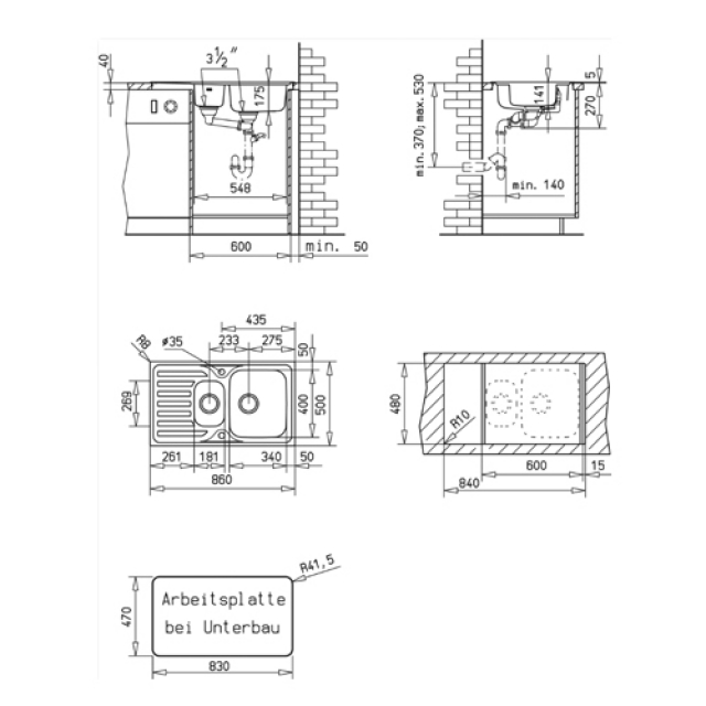 Arbeitsplattenausschnitt der CLASSIC 1 ½ B Spüle