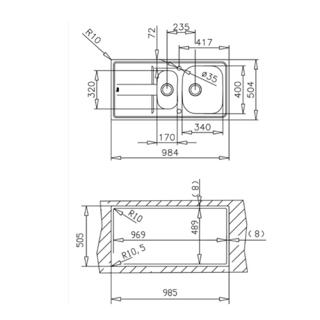 reversibel heißt: die Spüle läßt sich sowohl links als auch rechts herum einbauen; d. h. Sie können selbst entscheiden, ob Sie das Abtropfbecken auf der rechten oder auf der linken Seite haben möchten.