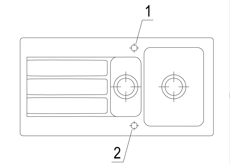 Option "Lochbohrungen durch Hersteller": Wenn Sie wünschen, dass aus Sicherheitsgründen die Lochbohrungen werksseitig vom Hersteller vorgenommen werden sollen, wählen Sie bitte diese Option. Hierfür benötigen wir von Ihnen die Nummern/Positionen des Hahnlochs/der Hahnlöcher, die V & B für Sie durchbohren soll. Bei der Spülenversion mit Handbetätigung benötigen Sie 1 Hahnlochbohrung für die Armatur, bei der Version mit Excenterbetätigung benötigen Sie 2 Lochbohrungen (Armatur und Excenter-Bedienung). Bitte beachten Sie hierzu die unten abgebildeten Maßzeichnungen, da die Positionen der Lochbohrungen bei reversiblen Spülen für die Becken-links und Becken-rechts-Versionen unterschiedlich sein können.