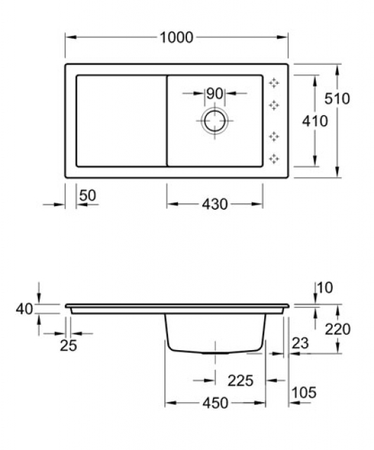 - Spülenmaße: L x B 1000 x 510 mm