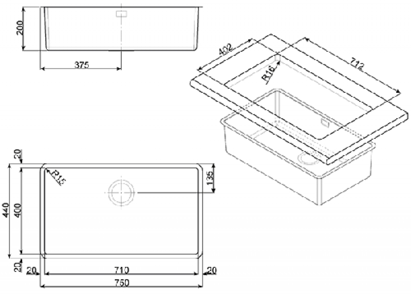 • Becken-Innenradius (Ecken) 15mm