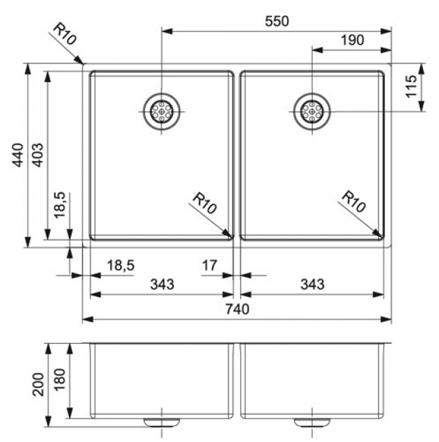 • Abmessung der Spüle: 343 x 403 / 343 x 403 mm