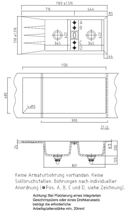 - Diese Spüle verfügt über 4 Möglichkeiten für Lochbohrungen. Diese können nur mit Spezial-Werkzeug des Herstellers vorgenommen werden! Ein Durchbohren vor Ort, auch durch Fachbetriebe, ist nicht möglich!