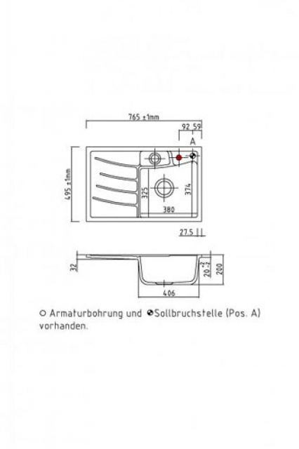 • Der Auslieferungszustand der Spüle beinhaltet eine Lochbohrung für die Armatur. Die zusätzliche(n) Lochbohrung(en) sind vorgestanzt (serienmäßige Vorbohrung); die Oberseite der Spüle ist verschlossen und muß vor Ort an den gekennzeichneten Stellen durchstoßen werden. Soll dies werksseitig vom Hersteller vorgenommen werden, wird dafür 13,-- Euro pro Spüle berechnet