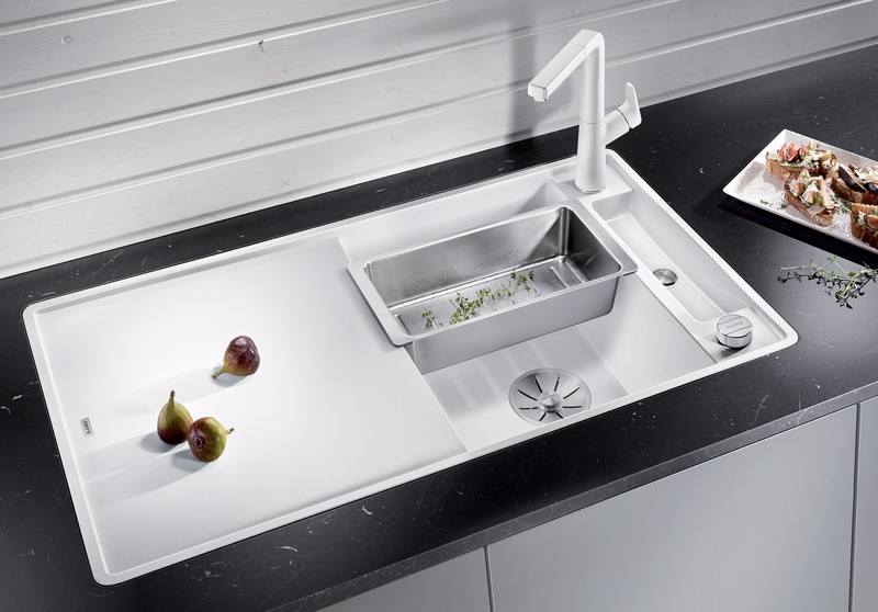 • Die Spüle Blancoaxia III 5 S-F ist in den Farbvarianten "anthrazit", "felsgrau", "alumetallic", "weiß", "jasmin" und "cafe" erhältlich.