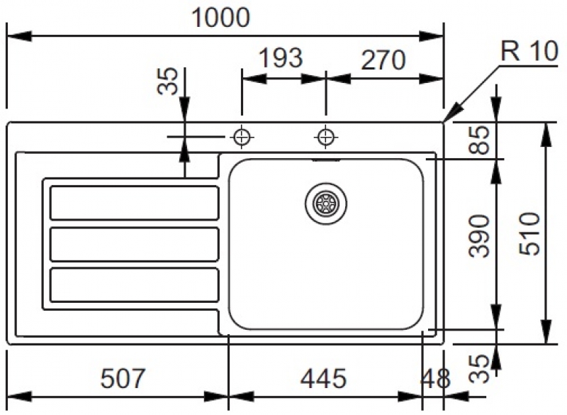 Einbauspüle EPOS SlimTop, ab 50 cm, Edelstahl glatt, Integral-Siebkorb-Excenterventil, Ausschnitt-Schablone, Becken rechts