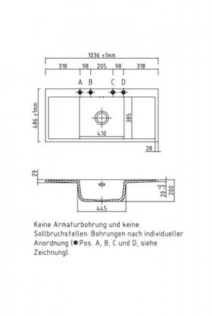 • Der Auslieferungszustand der Spüle beinhaltet KEINE Lochbohrung. Es sind keine Sollbruchstellen vorhanden; eine oder weitere Durchbohrung(en) kann nur im Werk des Herstellers Systemceram vorgenommen werden. Bitte geben Sie uns dafür exakt die von Ihnen gewünschte Position auf der Spüle an, gern auch anhand einer separaten Email, oder nehmen Sie diesbezüglich mit uns Kontakt auf. Bitte beachten Sie auch, daß Sie durch diese persönliche Positionierung der Lochbohrung einen für Sie individualisierten Artikel bestellen und erwerben, der nur für Sie speziell angefertigt wird. Diese Individualisierung und die damit verbundene nicht gegebene Möglichkeit eines anderweitigen Verkaufes durch uns kann zu einem Nicht-Wirksamwerden des Widerrufrechtes führen, welches individualisierte Produkte ausdrücklich ausnimmt. (Auf eine mit Produktmängeln zusammenhängende Reklamation hat dies selbstverständlich keinen Einfluß). Bitte sprechen Sie uns ggfs. hierauf an.