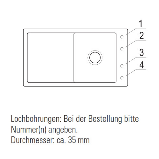 • Option "serienmäßige Vorbohrung": Der Auslieferungszustand der Spüle ist inklusive vorgestanzter Lochbohrungen (serienmäßige Vorbohrung); die Oberseite der Spüle ist dabei verschlossen und muß vor Ort an den gekennzeichneten Stellen durchstoßen werden.