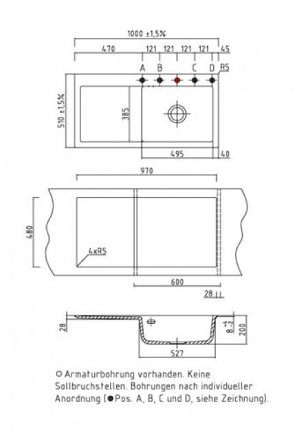 • Der Auslieferungszustand der Spüle beinhaltet eine Lochbohrung für die Armatur. Es sind keine Sollbruchstellen vorhanden; eine oder weitere Durchbohrung(en) kann nur im Werk des Herstellers Systemceram vorgenommen werden. Bitte geben Sie uns dafür exakt die von Ihnen gewünschte Position auf der Spüle an, gern auch anhand einer separaten Email, oder nehmen Sie diesbezüglich mit uns Kontakt auf. Bitte beachten Sie auch, daß Sie durch diese persönliche Positionierung der Lochbohrung einen für Sie individualisierten Artikel bestellen und erwerben, der nur für Sie speziell angefertigt wird. Diese Individualisierung und die damit verbundene nicht gegebene Möglichkeit eines anderweitigen Verkaufes durch uns kann zu einem Nicht-Wirksamwerden des Widerrufrechtes führen, welches individualisierte Produkte ausdrücklich ausnimmt. (Auf eine mit Produktmängeln zusammenhängende Reklamation hat dies selbstverständlich keinen Einfluß). Bitte sprechen Sie uns ggfs. hierauf an.