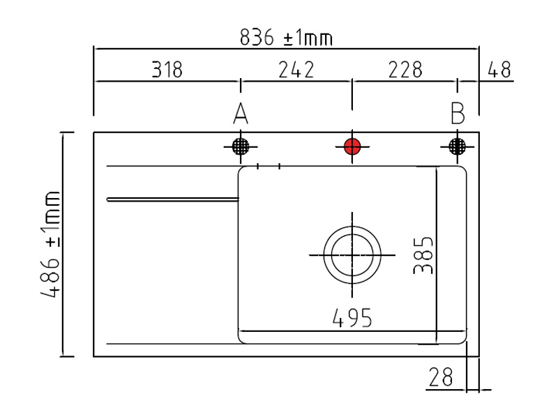 • Option Lochbohrungen: Wenn Sie wünschen, dass aus Sicherheitsgründen die zusätzlichen Lochbohrungen werksseitig vom Hersteller vorgenommen werden sollen, wählen Sie bitte diese Option. Hierfür benötigen wir von Ihnen die Nummern/Positionen des Hahnlochs/der Hahnlöcher, die Systemceram für Sie durchbohren soll. Bei der Spülenversion mit Handbetätigung benötigen Sie 1 Hahnlochbohrung (bereits werkseitig vorhanden) für die Armatur, bei der Version mit Excenterbetätigung benötigen Sie 2 Lochbohrungen (Armatur und Excenter-Bedienung). Bitte beachten Sie hierzu die unten abgebildeten Maßzeichnungen, da die Positionen der Lochbohrungen bei reversiblen Spülen für die Becken-links und Becken-rechts-Versionen unterschiedlich sein können.