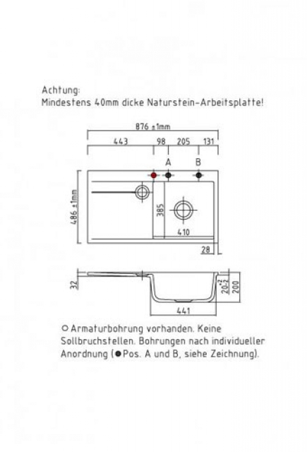 ACHTUNG: Bei Platzierung eines integrierten Geschirrspülers oder eines Drehkarussells unter dem Abtropfteil beträgt die erforderliche Dicke der Natur- oder Kunststein- Arbeitsplatte mind. 40 mm!