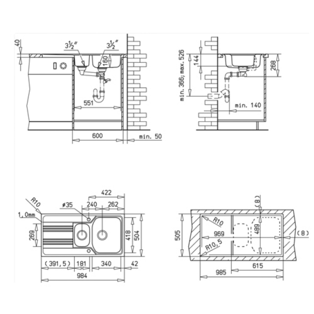 - Flächenbündiger Einbau: 985 x 505 mm; Eckradius 10,5 mm