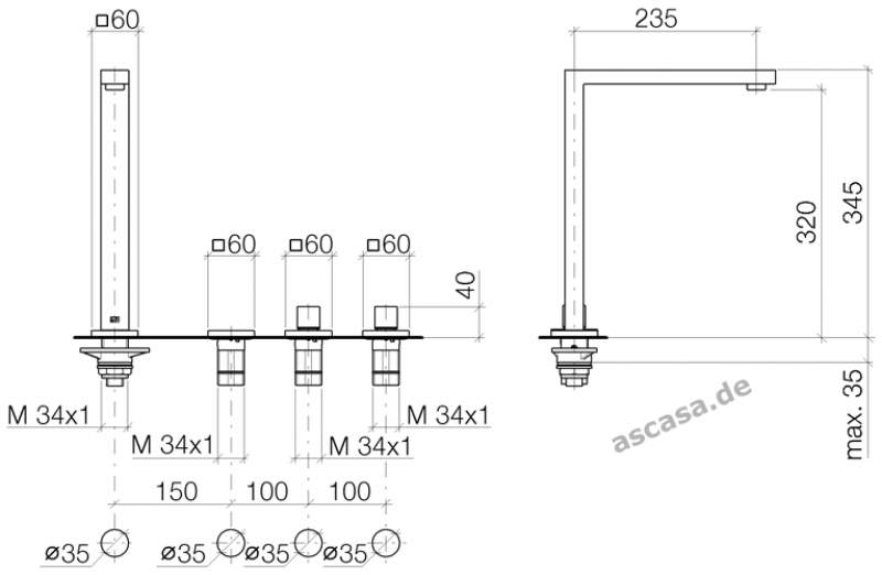 - Bohrungsdurchmesser je Bedienelement 35 mm