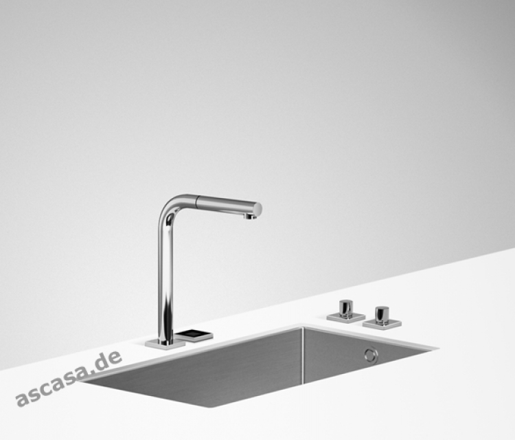 Für den Wasserauslass wird die Mischbatterie ELIO von Dornbracht mitgeliefert. Dieser Dornbracht-Wasserhahn aus der Serie Elio verfügt über einen herausziehbaren Brauseschlauch für komfortables und kompromissloses Arbeiten in der Küche. Die Küchenarmatur Elio hat ein zeitloses Design und passt sich jedem Küchenstil an.
