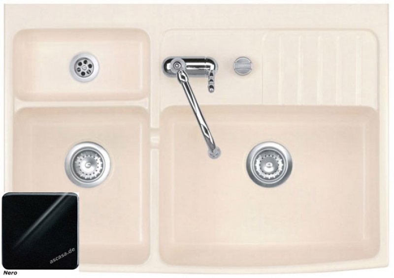 Das Füllen und Ablaufen der Spüle wird über einen runden Drehknebel auf der Oberseite der Spüle vorgenommen. Dieser Knebel, Excenterbetätigung genannt, verschließt oder öffnet den Ablauf der Spüle, je nachdem in welche Richtung er gedreht wird. Der Griff in das Spülwasser entfällt somit.