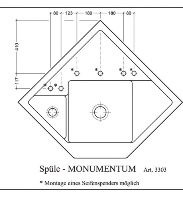 • Option "serienmäßige Vorbohrung": Der Auslieferungszustand der Spüle ist inklusive vorgestanzter Lochbohrungen (serienmäßige Vorbohrung); die Oberseite der Spüle ist dabei verschlossen und muß vor Ort an den gekennzeichneten Stellen durchstoßen werden.