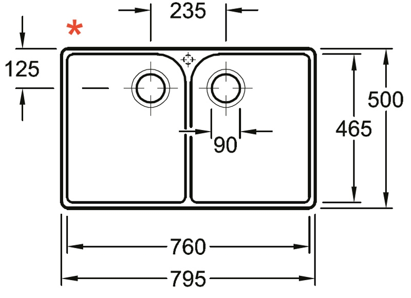 - diese Spüle ist nur auf einem Unterschrank oder auf wandhängenden Konsolen montierbar; ein flächenbündiger Einbau oder der Einsatz als Unterbau-Spüle ist nicht möglich