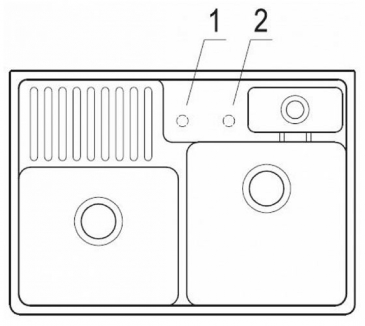 - Option "Lochbohrungen durch Hersteller": Wenn Sie wünschen, dass aus Sicherheitsgründen die Lochbohrungen werksseitig vom Hersteller vorgenommen werden sollen, wählen Sie bitte diese Option. Hierfür benötigen wir von Ihnen die Nummern/Positionen des Hahnlochs/der Hahnlöcher, die V & B für Sie durchbohren soll. Bei der Spülenversion mit Handbetätigung benötigen Sie 1 Hahnlochbohrung für die Armatur, bei der Version mit Excenterbetätigung benötigen Sie 2 Lochbohrungen (Armatur und Excenter-Bedienung). Bitte beachten Sie hierzu die unten abgebildeten Maßzeichnungen, da die Positionen der Lochbohrungen bei reversiblen Spülen für die Becken-links und Becken-rechts-Versionen unterschiedlich sein können.