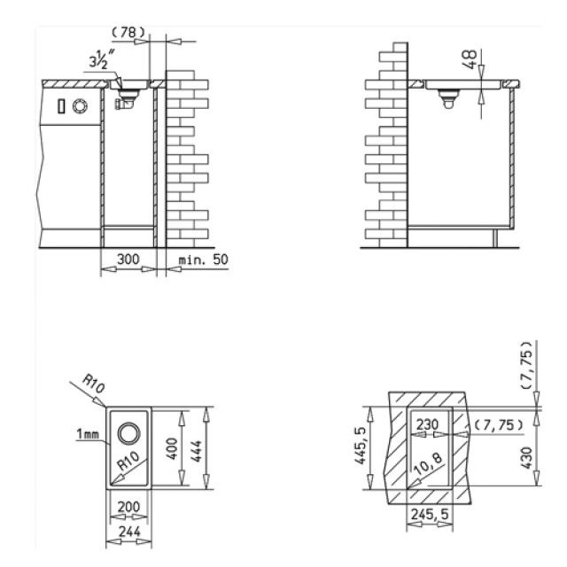 Arbeitsplattenausschnitt der RADEA Tropfmulde 200 / 400 Spüle