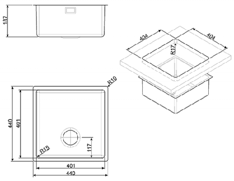 • Becken-Innenradius (Ecken) 15mm