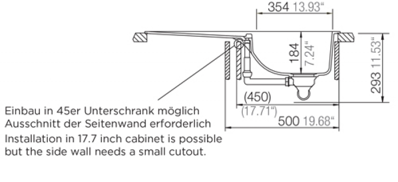 • für Unterschränke ab 50 cm, (auch 45 cm möglich, siehe Skizze, Ausschnitt der Seitenwand des Unterschrankes ist dann erforderlich)