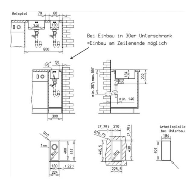 Arbeitsplattenausschnitt der RADEA 180 / 400 Spüle