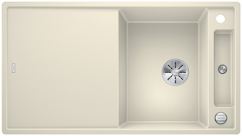 • Die Spüle Blancoaxia III 5 S  ist in den Farbvarianten "anthrazit", "felsgrau", "alumetallic", "perlgrau", "weiß", "jasmin", "champagner", "tartufo", "muskat" und "cafe" erhältlich.