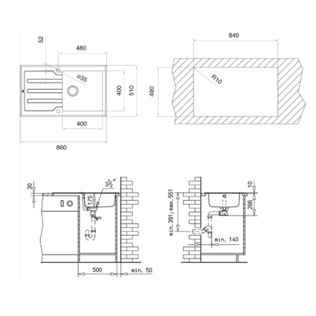 Arbeitsplattenausschnitt der LUX 1B 1D 86 Spüle