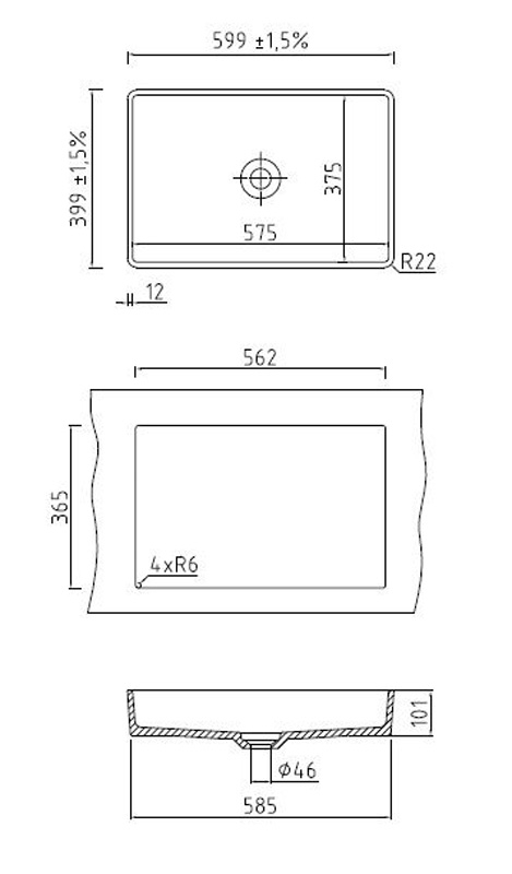 • Wir empfehlen, aufgrund der Toleranzen (± 1,5 %) den Ausschnitt anhand des gelieferten Beckens zu fertigen.