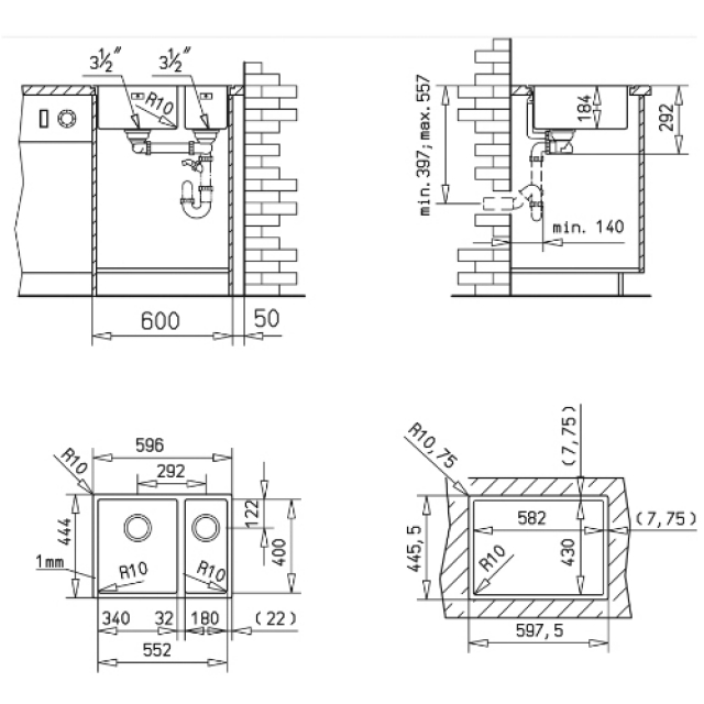 Arbeitsplattenausschnitt der RADEA 340 / 400 + 180 / 400 Spüle