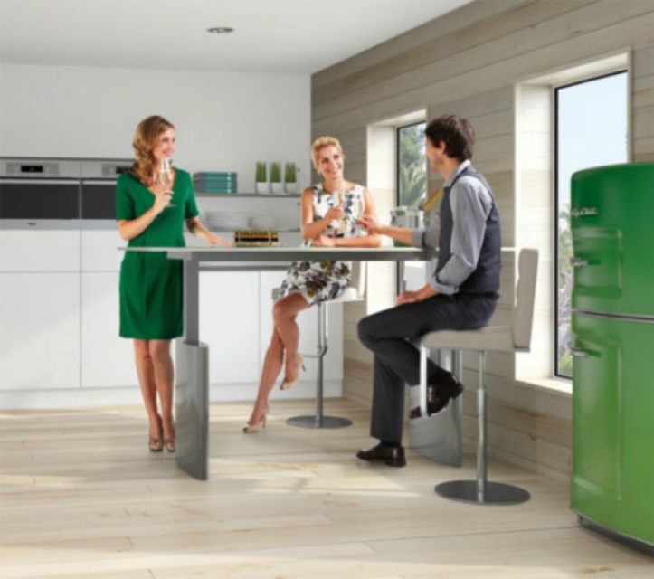 Der variable Zwei-Säulen-Tisch verwandelt die zentral geplante Arbeitszone in ein multifunktionales Möbelstück. Sitzen oder stehen, genießen oder arbeiten — für alle gewünschten Funktionen wird die Platte ganz einfach auf die richtige Höhe gehoben oder gesenkt.