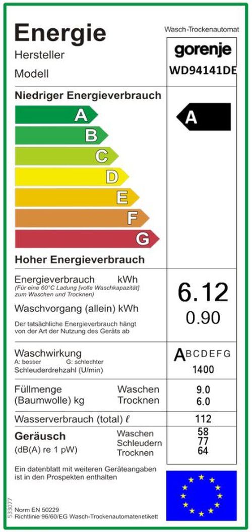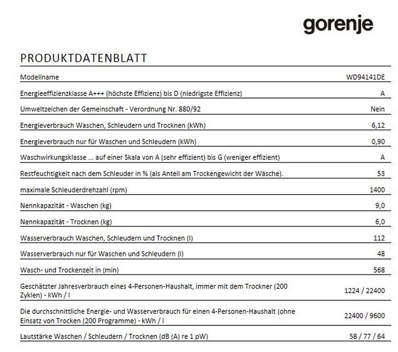 • Energieverbrauch Waschen/Trocknen (max. Beladung): 6,12 kWh, 1424 kWh/Jahr