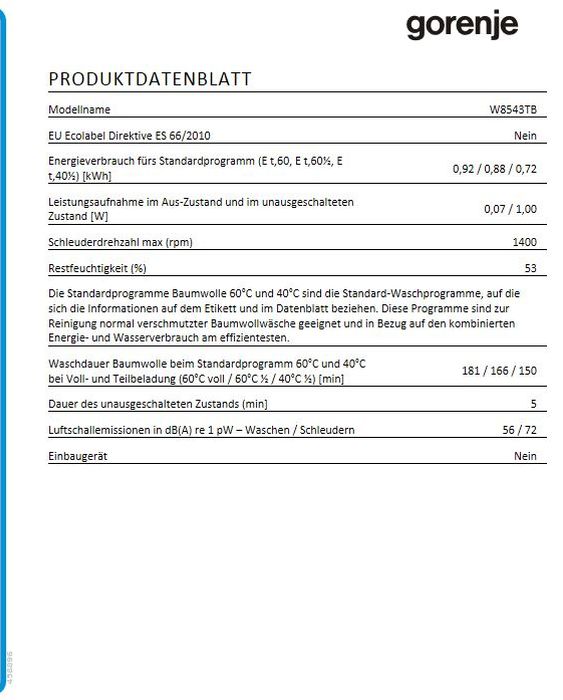 • Schleuderdrehzahl max./Restfeuchte: 1400 U/min/53%